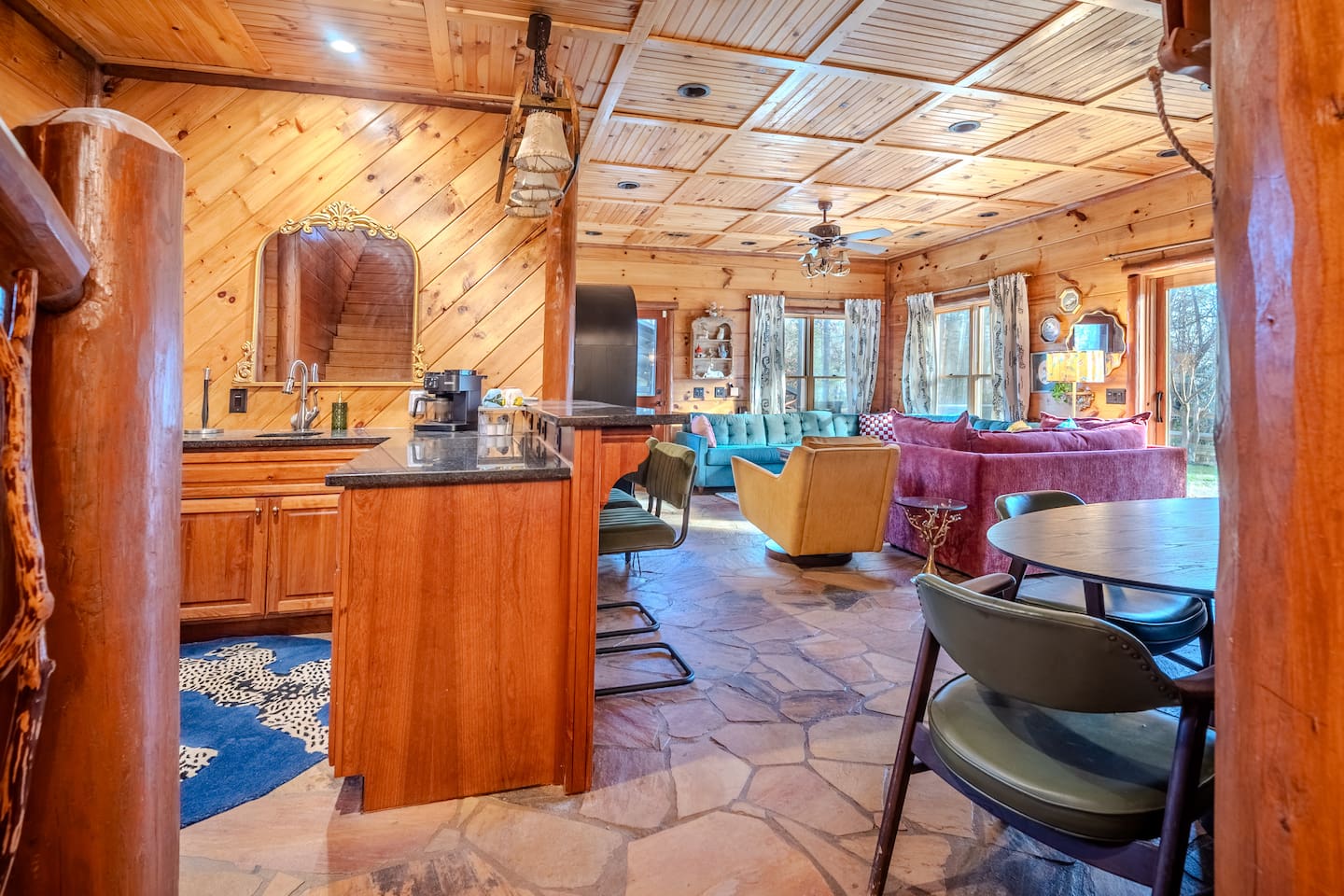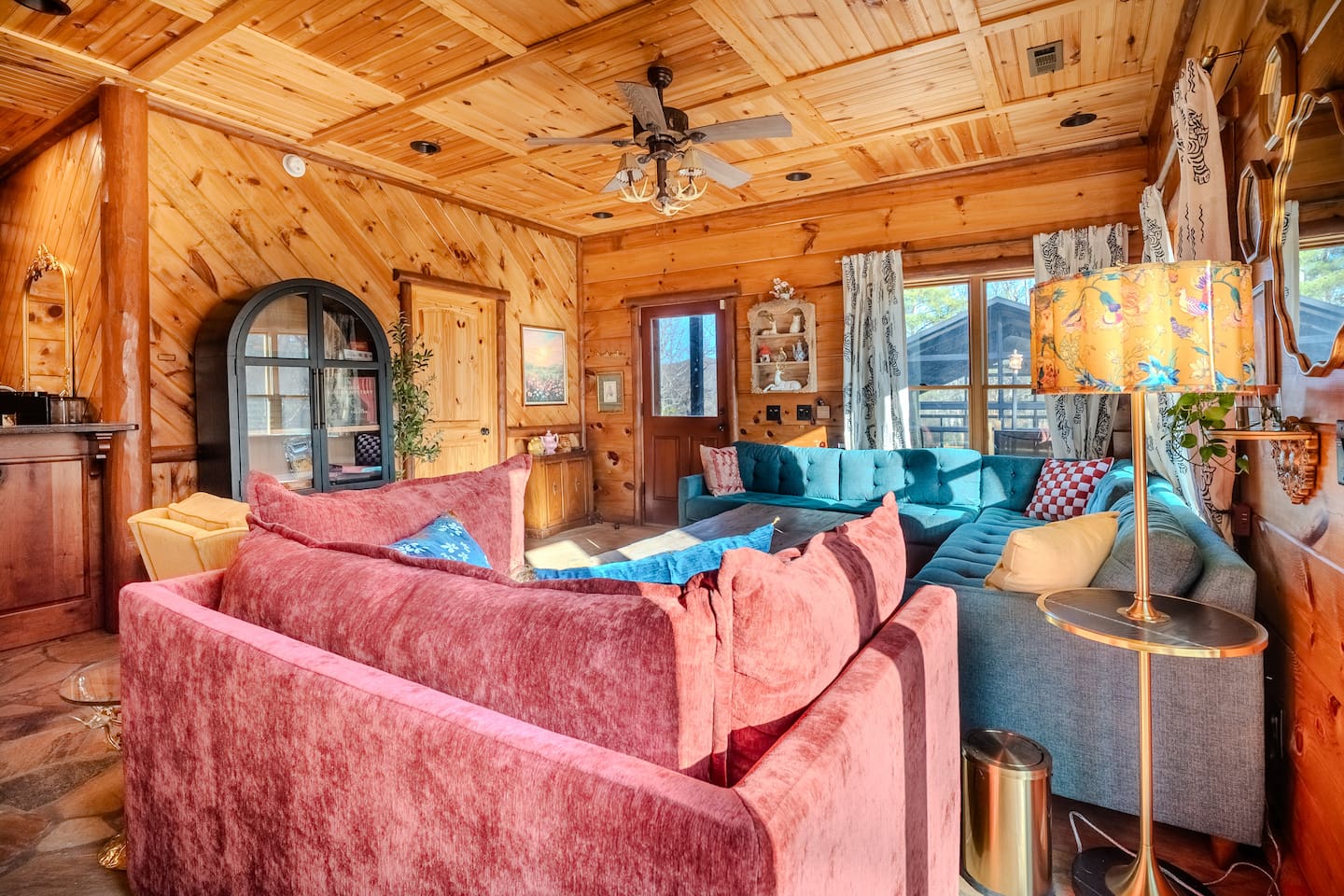 This is not a standard cabin rental. The Gilded Fox Estate is a fully curated artist’s estate where every detail has been thoughtfully designed — from statement lighting and vibrant interiors to expansive porches and outdoor amenities. Whether you’re planning a family getaway, creative retreat, or celebratory escape, this home offers both unforgettable aesthetics and effortless comfort. For creative types who love to document there stay, there's no bad angle to take a photo at this estate.