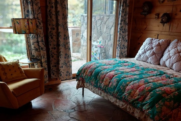 The Cuckoo room on the bottom floor offers cute decor, a large closet, very comfy king bed, sitting area, private en suite bath, and walk out to the hot tub and yard.